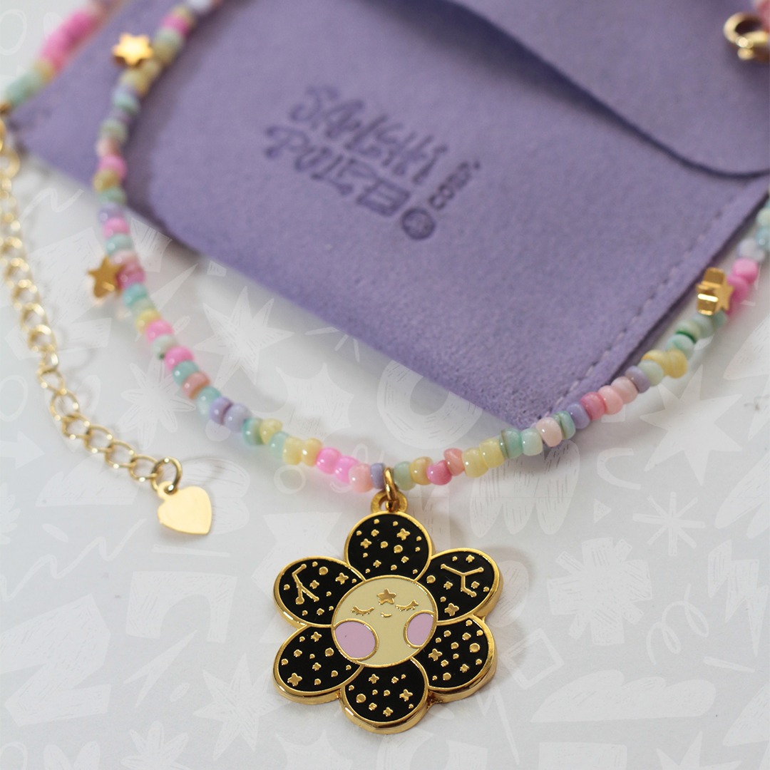 Esta gargantilla está compuesta por perlitas de concha de colores y estrellitas con chapa de oro, acompañadas de un dije de flor : una ilustración original que representa cómo todo en este planeta está hecho de polvo de estrellas… y tú también. 🌠