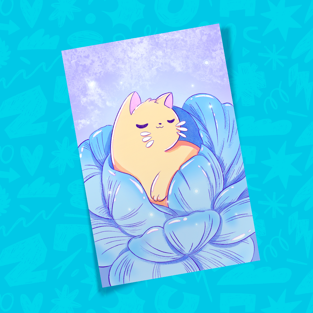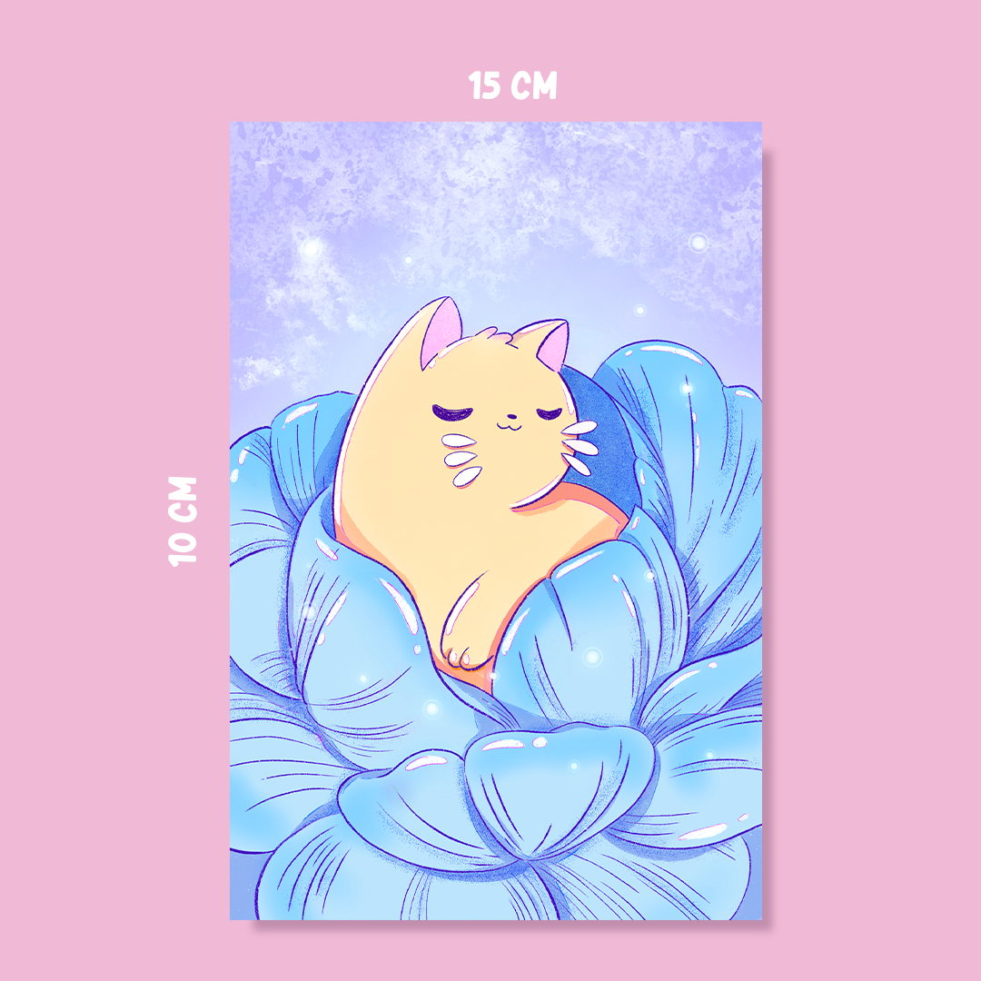 Este print captura la esencia de la paz que solo los amantes de los gatos entendemos: ese momento de quietud absoluta que nos regalan. Es más que una ilustración; es un recordatorio tangible en tu pared de que la serenidad existe, y a menudo, ronronea.