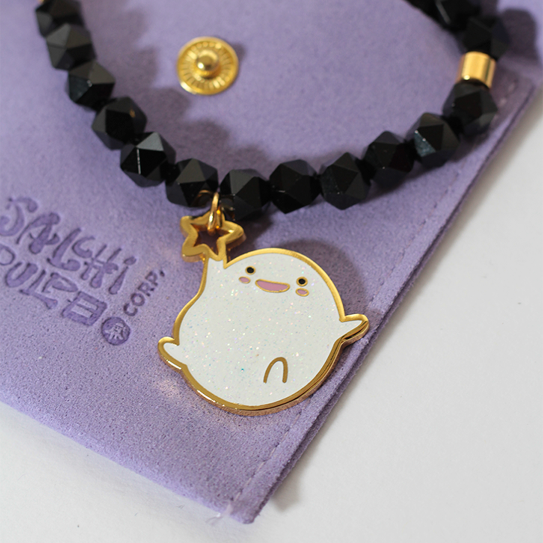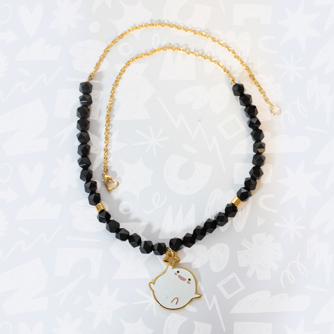 Está hecho con piedras de ónix negras y detalles dorados que evocan el cielo y el universo, además de una cadena dorada bañada en chapa de oro.