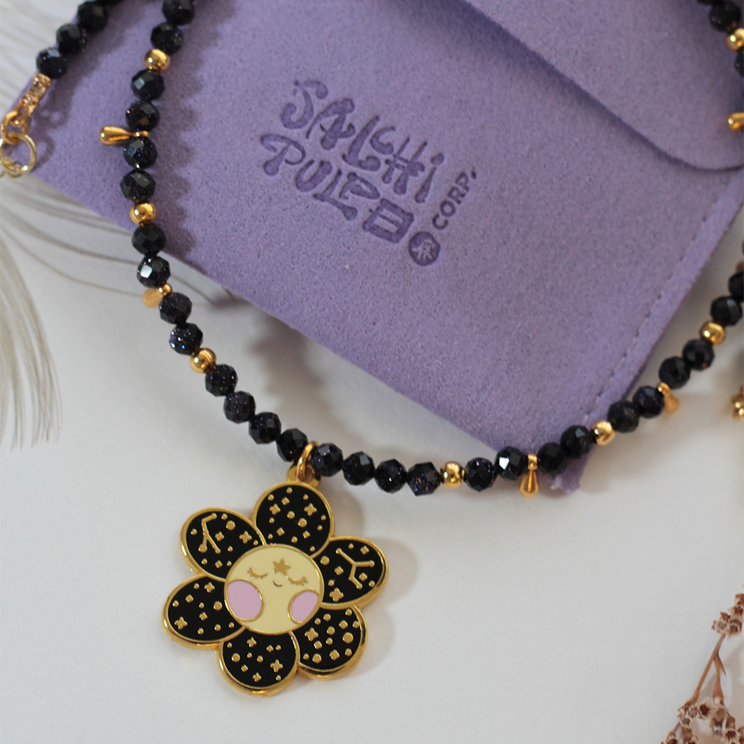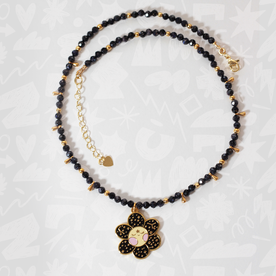 Esta gargantilla con venturina —Atrae prosperidad y suerte y un dije de flor con estrellas : una ilustración original que representa cómo todo en este planeta está hecho de polvo de estrellas… y tú también. 🌠